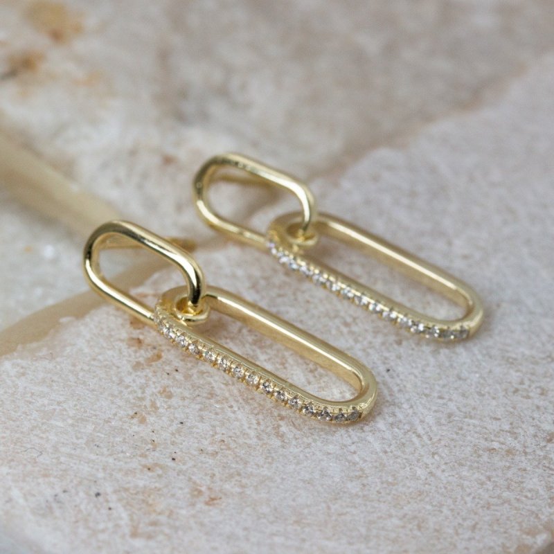 These vermeil dangle earrings reimagine the paperclip as a refined accessory, featuring interlocking links enhanced with cubic zirconia sparkle.  Versatile enough for boardroom meetings or an evening out, they embody the art of effortless style.